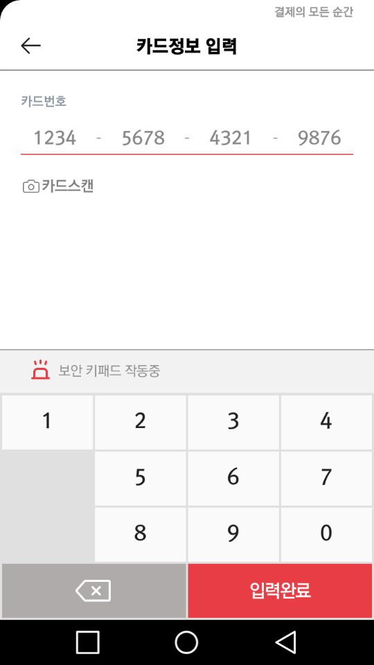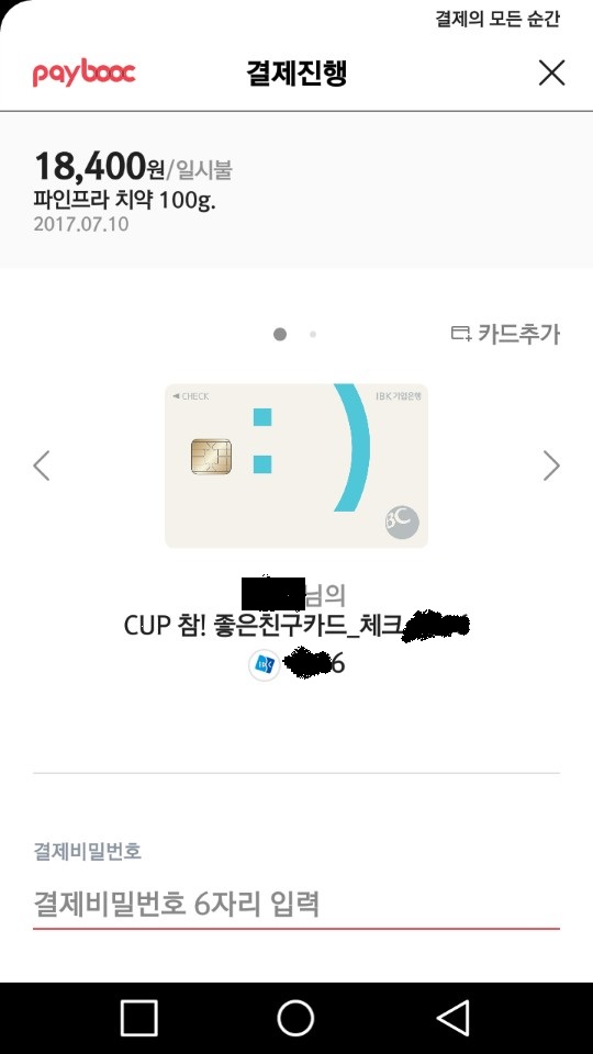 카드가 성공적으로 추가된 화면을 보실 수 있습니다. 결제 비밀번호를 입력 후 결제를 진행하세요.