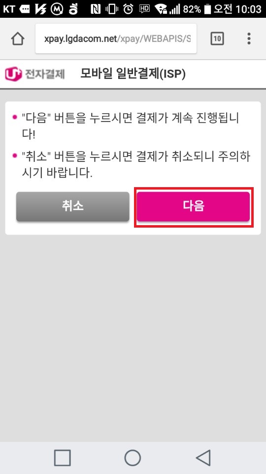 만약, ISP를 설치하지 않고 결제진행을 시도하면, 전혀 결제가 되지 않고 "다음"으로 넘어가지 않습니다.