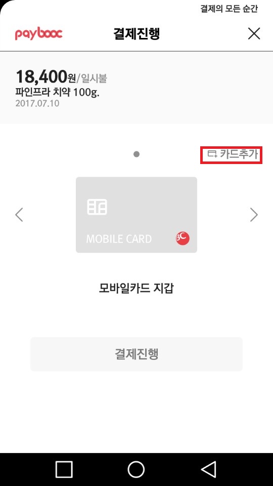 4. 처음 결제시도 하신분이면, 아래 화면처럼 나오는데, "카드추가"버튼을 클릭 후 아래와 같이 진행바랍니다.