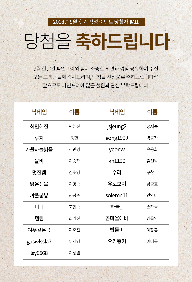 2018년 9월 후기 이벤트 당첨자 안내