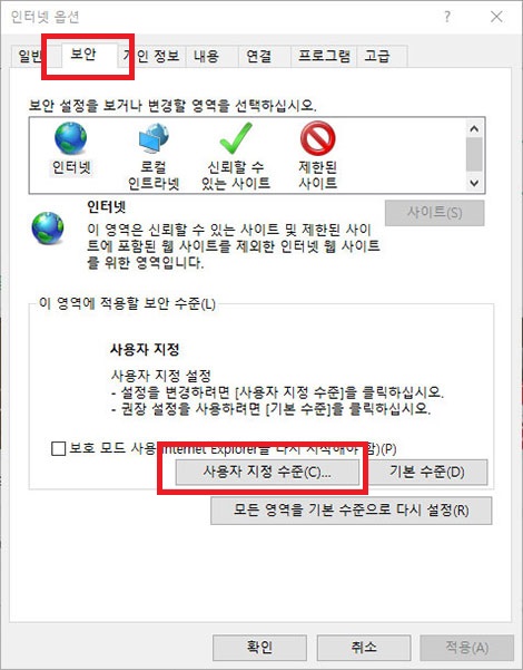 상단에 보안이란 탭을 클릭후 아래쪽에 사용자 지정 수준이란 버튼을 클릭해주세요.