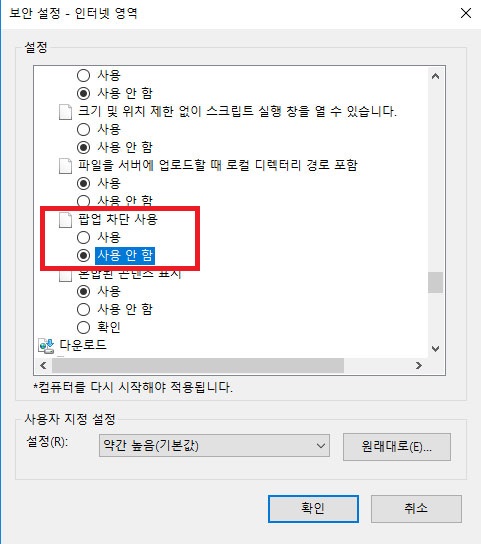 사용자 지정수준 버튼을 클릭 후에 위와같이 팝업 차단 사용이란 부분에서 사용 안 함을 선택후 확인 버튼을 클릭해주세요.