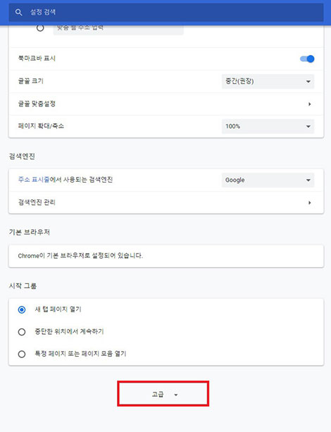 설정 메뉴를 클릭하면 위 그림과 같은 창이 표시되며 창의 하단에 고급이란 글자를 클릭하시면