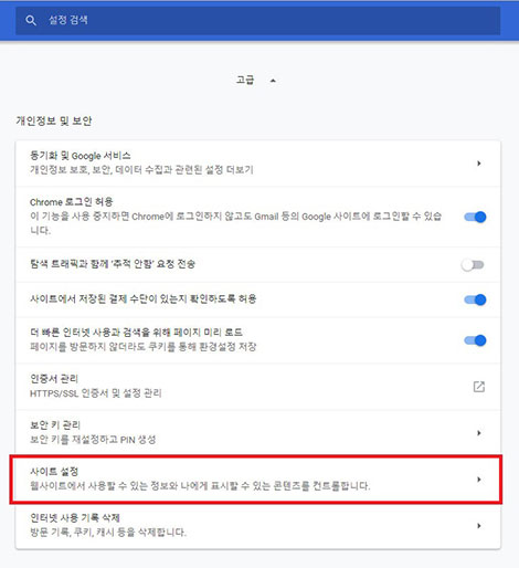 고급을 클릭 후 표시된 창(위 그림)에서 사이트 설정이란 메뉴를 클릭해 주세요.