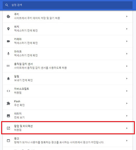 그중에 팝업 및 리디렉션이란 메뉴를 클릭해주세요.