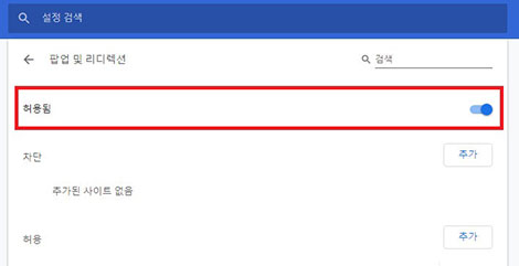 팝업 및 리디렉션 메뉴를 클릭 후 표시된 창(위 그림)에서 팝업 및 리디렉션 허용설정을