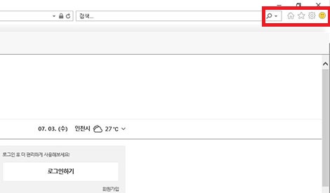 인터넷창(익스플로러) 오른쪽 상단에 위 그림에서 표시된 영역에 아이콘(톱니바퀴 모양)을 클릭해주세요.