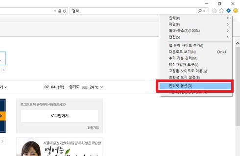 아이콘(톱니바퀴 모양)을 클릭 후 표시되는 메뉴에서 인터넷 옵션(O)이라고 표시된 메뉴를 클릭해주세요.