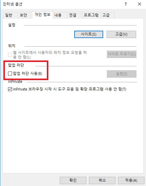 그리고 마지막으로 상단에 개인정보 탭을 선택 후 그림에서 표시된 것과 같이 팝업 차단 사용이란