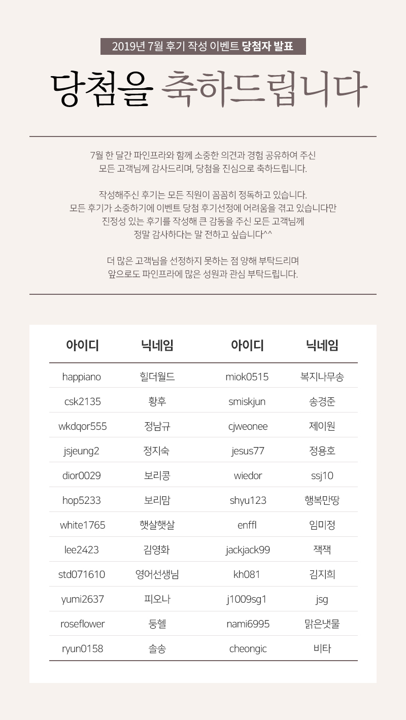 2019년 7월 후기 이벤트 당첨자 안내