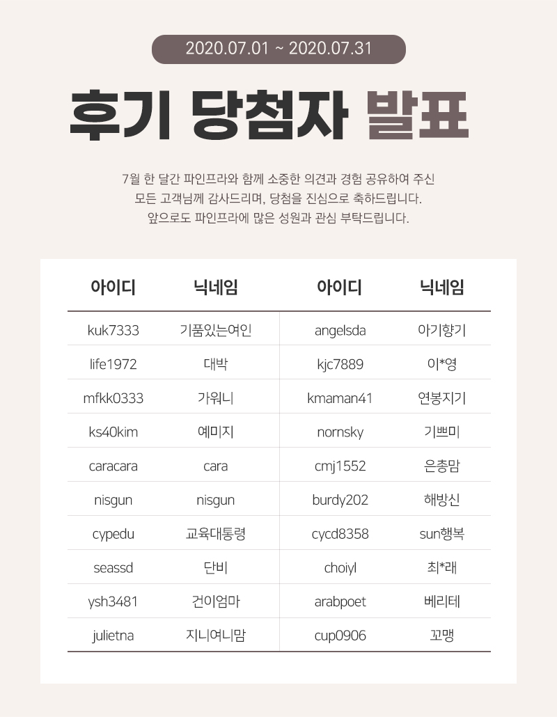 2020년 7월 후기 이벤트 당첨자 안내