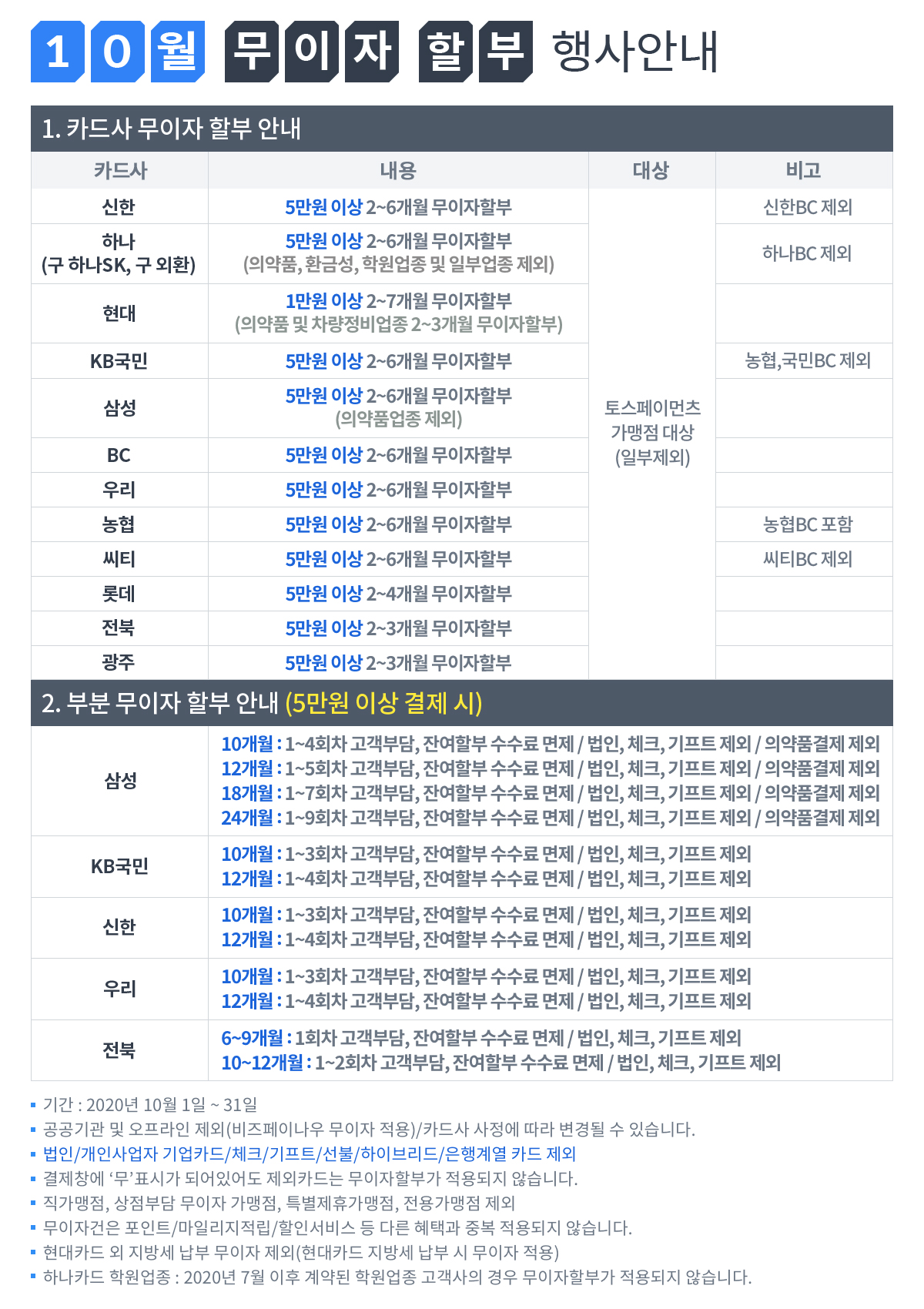 2020년 10월 무이자 할부 안내