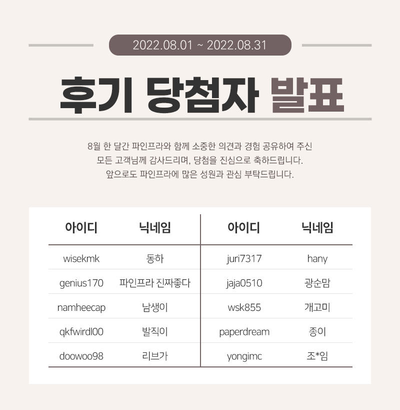 2022년 8월 후기 이벤트 당첨자 안내