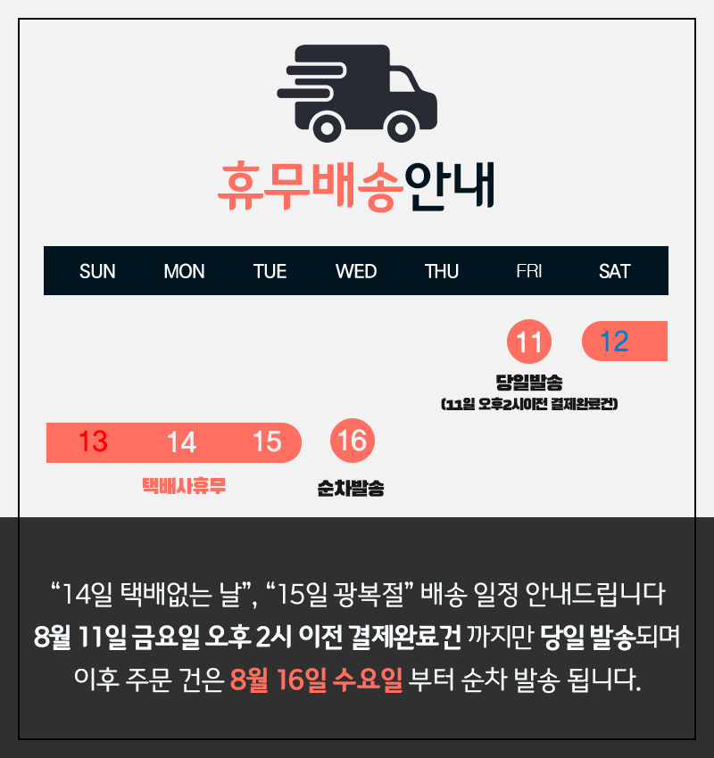 8월 11일(금) 오후 2시 이전 주문 및 결제 완료된 주문까지 당일 발송 처리 되며,