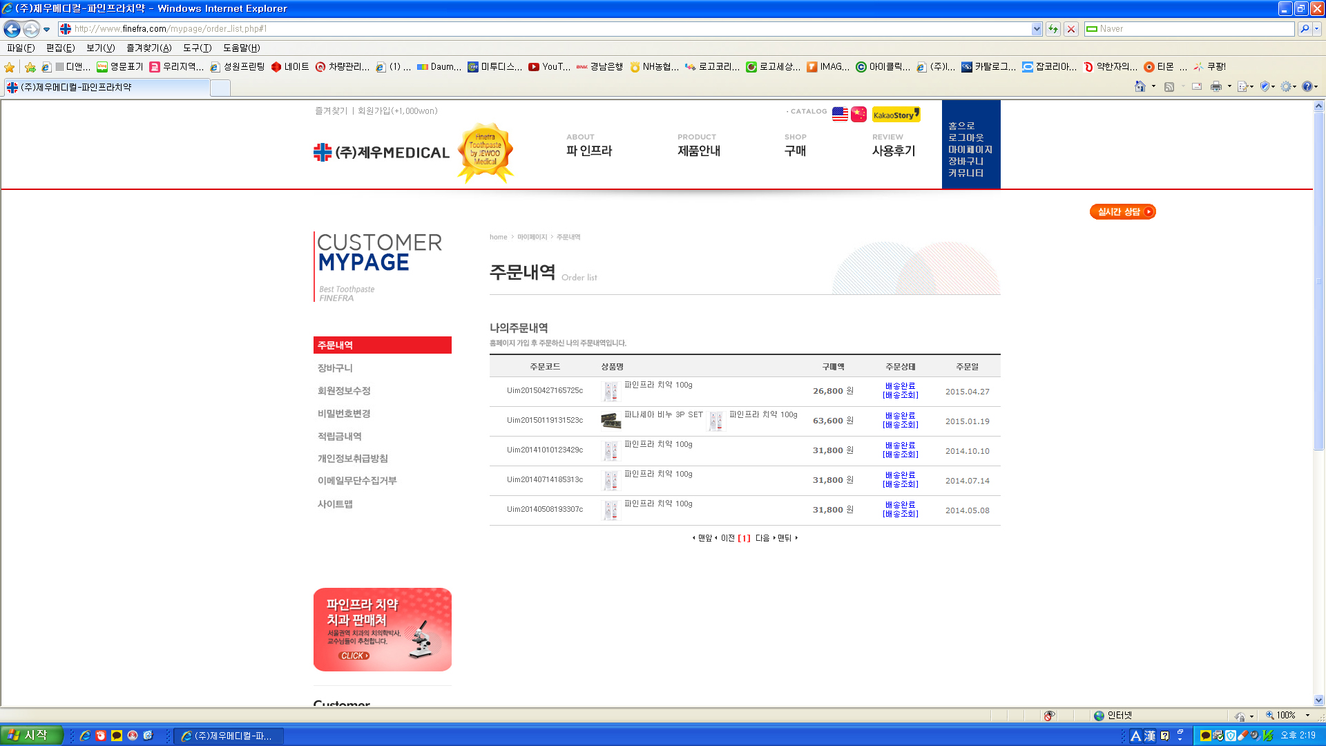 저는 첨부한 사진에서 보시듯 2014년 5월 18일 첫 구매를 시작으로 지금까지 꾸준히 파인프라 치약을 사용하고 있습니다.