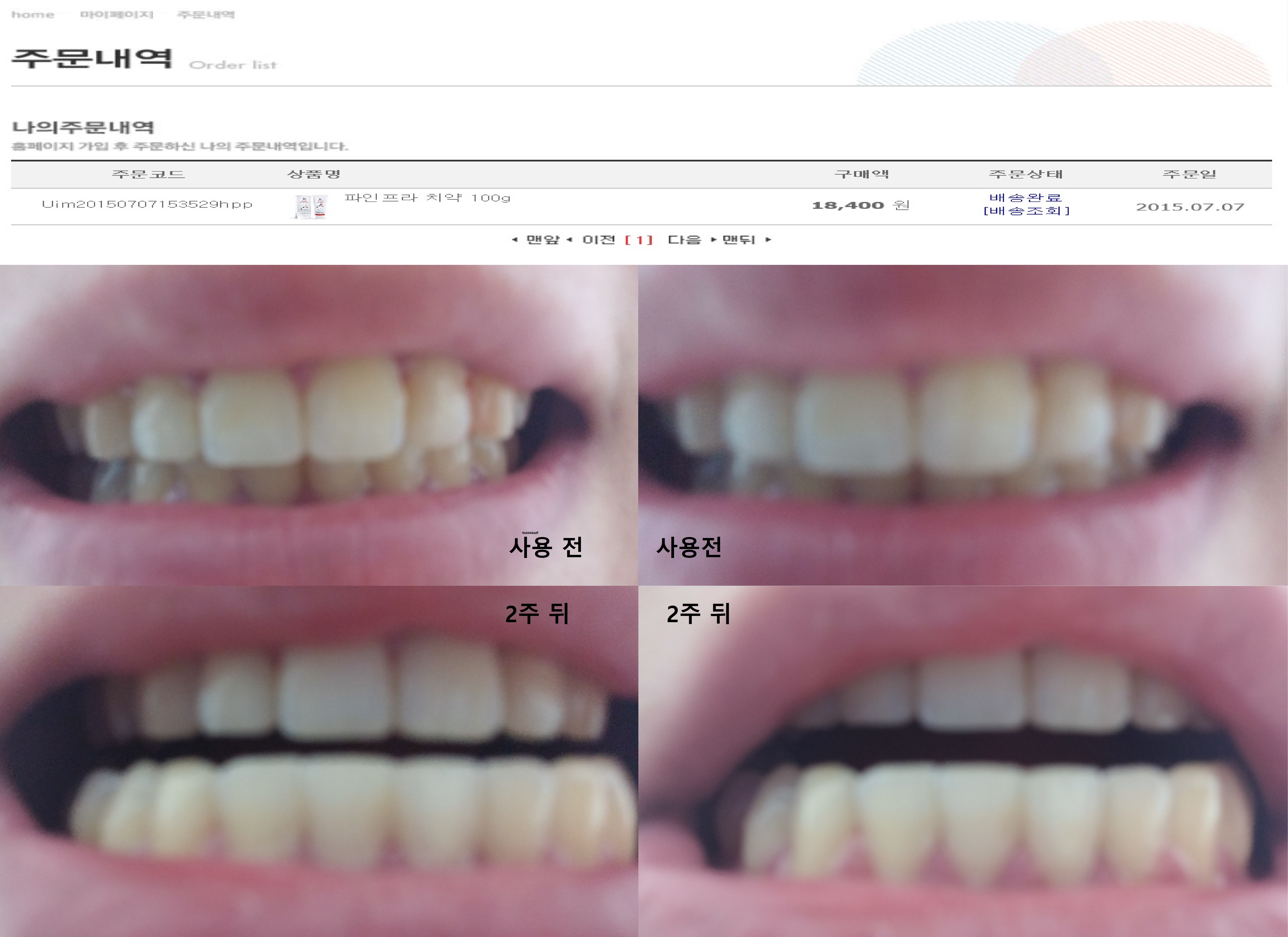 매일 입에서 냄새나고 피나고 혓바닥에 백태까지 꼈었는데 파인프라 치약 사용한후 3일뒤부터 잇몸에서피가나질 않았습니다. 기존의 양치법도 바꿨습니다. 파인프라 치약외에는 절대 다른 치약을 사용하지 않았고, 치약을 집에 두고 외식을 하였을때는 아얘 양치를 하지 않았습니다. 대신 집에가면 바로 양치를 했고,기존 한번 양치한후 5번만 헹구어 내던것을 매번 2번씩 양치 하였으며 2번째는 물로 최소 10번 이상은 헹구었습니다. 앞으로 얼마나 더 좋아질지 모르겠습니다. 일단 입이 개운하고 잇몸에서 피가 안나는것만으로도 너무 만족합니다. 좋아질거라고 믿고 사용하시는게 도움이 되실것 같습니다. 제가 구매한 내역과 사용전 사진과 2주간 사용후 사진을 첨부합니다. 치약 하나로 이렇게나 좋아질 수 있다니 신기하기만 합니다.