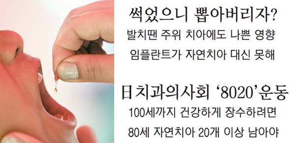 치아는 오복 중 하나라고 말하지만 제대로 관리하지 않고 쉽게 뽑는 경향이 있다. 미국의 한 연구기관은 건강한 치아 하나의 경제적 가치가 약 3만달러, 즉 약 3400만원이라는 연구 결과를 발표한 바 있다. 만약 명품 가방이나 자동차가 3000만원짜리라면 함부로 흙바닥에 내동댕이치고, 자동차가 긁히든 말든 숲으로 돌진하는 사람은 없을 것이다.