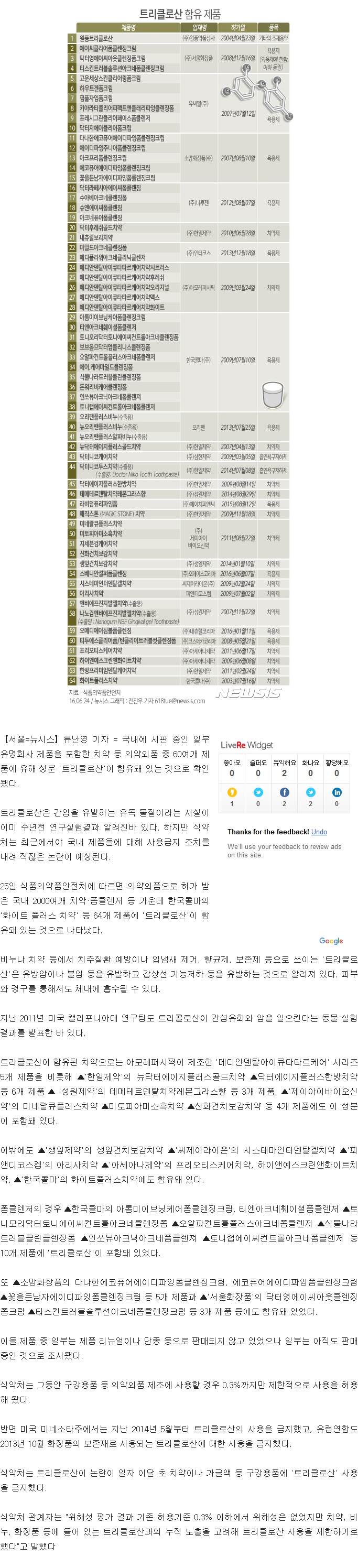 치약·폼클렌저 64개 제품 트리클로산 함유…간암유발 유해물질 논란-스크랩